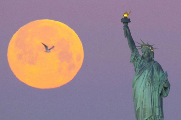 A super snow moon sets behind the Statue of Liberty shorty after sunrise in New York City on February 19, 2019. File Photo by John Angelillo/UPI | License Photo