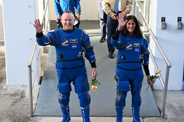 1 of 4 | NASA astronauts Butch Wilmore and Suni Williams as they prepare for a planned Wednesday morning launch of Boeing’s Starliner mission to the International Space Station. Liftoff was planned for 10:52 a.m. EDT. Photo by Joe Marino/UPI | License Photo