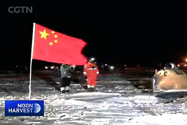 A screen grab of the minutes after the Chang’e 5 lunar probe landed in China on Thursday, December 17, 2020. China celebrated the safe landing of if its first lunar probe returning with samples from the moon’s surface. CGTN Screen Shot/UPI | License Photo