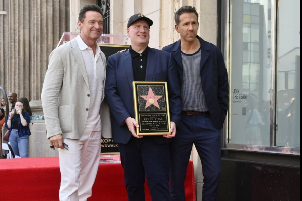 Producer Kevin Feige holds a replica plaque as he is joined by “Deadpool & Wolverine” actors Hugh Jackman (L) and Ryan Reynolds during an unveiling ceremony honoring him with the 2,785th star on the Hollywood Walk of Fame in Los Angeles on July 25. File Photo by Jim Ruymen/UPI | License Photo