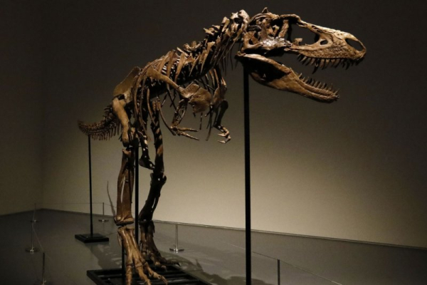A study suggests that a prolonged dust cloud may have played a larger role than previously thought in the extinction of dinosaurs. Here, a dinosaur fossil of a Gorgosaurus Skeleton is displayed at Sotheby’s auction house in New York City in 2022. File photo by Peter Foley/UPI | License Photo