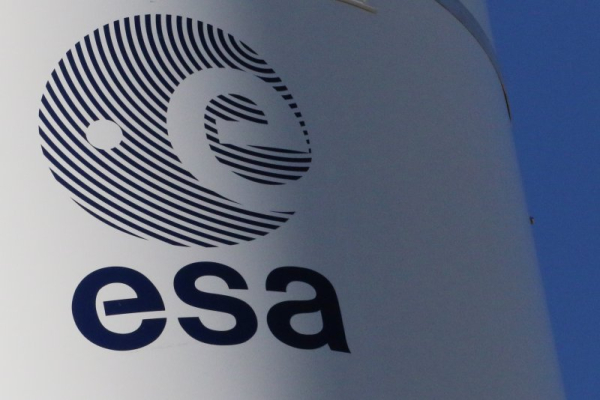 The European Space Agency’s logo is seen at the International Astronautical Congress in Bremen, Germany, on October 1, 2018. The ESA launched two satellites into space that would later create an artificial solar eclipse. File Photo by Focke Strangmann/EPA-EFE