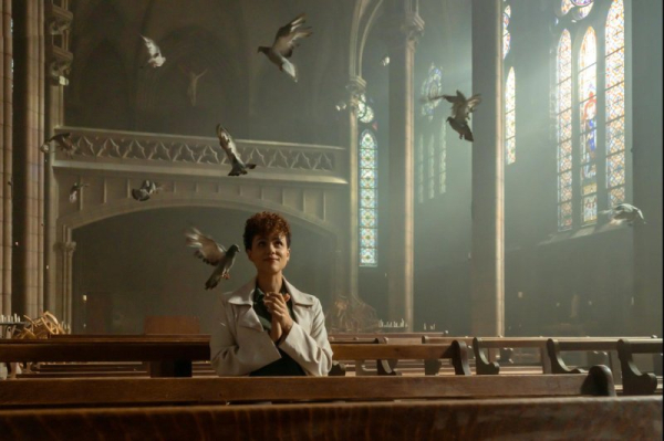 Zee meets her handler (Sam Worthington) in a church with doves flying around. The camera follows his entrance, tracking him across the pews.
