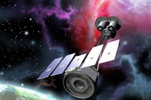 1 of 2 | An illustration depicts NASA’s IXPE satellite pointed at a nebula in space with three identical X-ray optics imagers at top, sensors at bottom and solar arrays. Collaborating with the Italian Space Agency, the NASA team launched it into orbit 372 miles above the Earth in 2021. Illustration courtesy of NASA