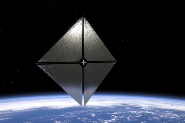 An artist’s concept of NASA’s Advanced Composite Solar Sail System spacecraft in orbit. NASA plans to launch the solar sail this week from New Zealand to perform navigation tests, using sunlight to propel it. Image courtesy of NASA/Aero Animation/Ben Schweighart