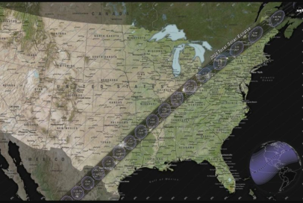 NASA said Friday the April 8 solar eclipse will be visible in most of North America. Along the depicted “line of totality” millions of people from Texas to Maine will see a total eclipse of the Sun. Image courtesy of NASA