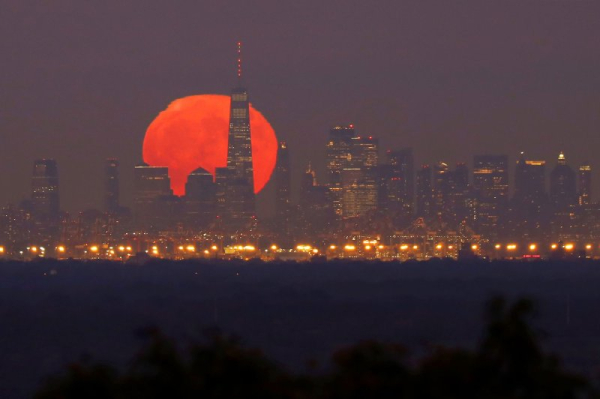 1 of 4 | The last blue moon rises behind One World Trade Center and the Manhattan skyline shorty after sunset on October 31, 2020. File Photo by John Angelillo/UPI | License Photo