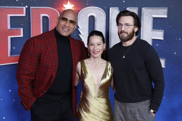 Left to right, stars Dwayne Johnson, Lucy Liu and Chris Evans arrive on the red carpet at the premiere of Amazon’s “Red One” in New York City on November 11, 2024. Photo by John Angelillo/UPI | License Photo