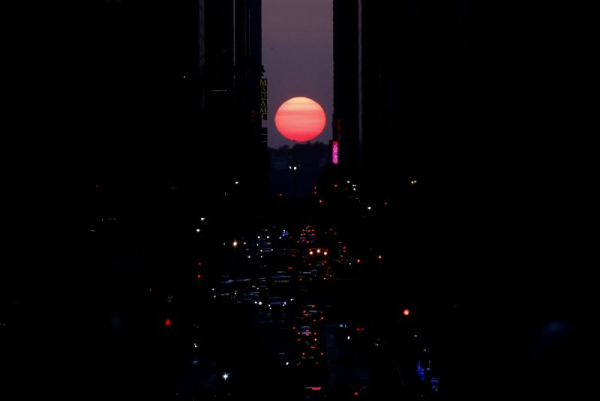 The setting sun moves across 42nd street during a Manhattanhenge sunset event in New York City on May 30, 2023. The Manhattanhenge sunset comes twice a year when the setting sun aligns precisely with Manhattan’s street grid. File Photo by John Angelillo/UPI | License Photo