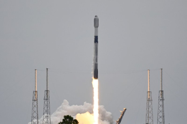 A SpaceX Falcon 9 rocket launches 56 “Starlink” satellites into cloudy skies at the Cape Canaveral Space Force Station, Florida in June, 2023. It launched 22 Starlink satellites from Vandenberg Space Force base in California Thursday afternoon. Photo by Joe Marino/UPI | License Photo