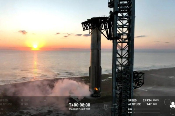 The fifth test flight of SpaceX’s Starship spacecraft successfully ended Sunday with a controlled “subsonic belly flop” into the Indian Ocean after the 20-story-tall Super Heavy booster returned to the launch site where it was “caught” by a special launch tower nicknamed “Mechazilla.” Photo courtesy of SpaceX/X